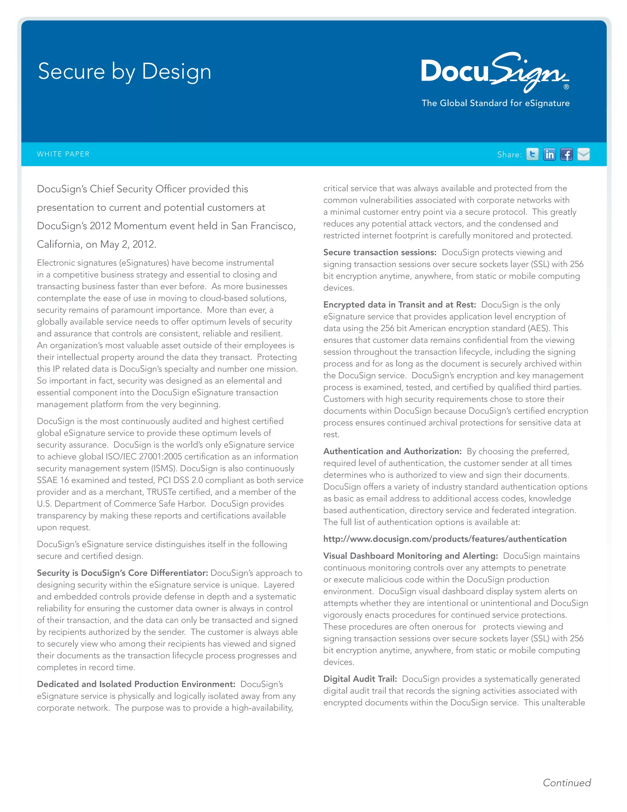 The document summarizes the security features and certifications of DocuSign's electronic signature platform. It describes how security was designed as a core part of the platform from the beginning to protect customers' intellectual property and transaction data. Key security elements discussed include dedicated and isolated production environments, encrypted data transmission and storage, authentication and authorization controls, monitoring and incident response systems, and digital auditing trails. DocuSign has multiple security certifications including ISO 27001, SSAE 16, PCI DSS, and TRUSTe to provide assurance around its security practices.