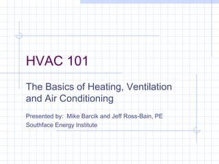 This document provides an overview of HVAC systems, including the basics of heating, ventilation, and air conditioning. It discusses key concepts like load calculations, heat transfer, psychrometrics, basic HVAC equipment, common system types, control devices, air distribution, and improved ventilation effectiveness. The goal of HVAC is to provide thermal comfort for occupants while allowing buildings to be used under various outdoor conditions.