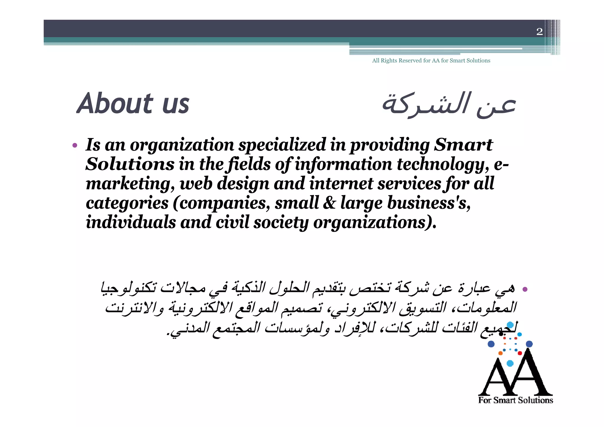 1) The document is about an organization called AA Organization For Smart Solutions that provides IT, marketing, web design, and internet services.