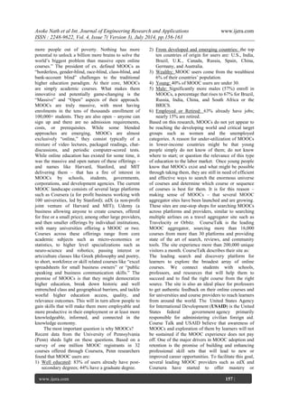 This document discusses a study on the impact of MOOCs (Massive Open Online Courses) in Indian higher education. It begins by providing background on the development of MOOCs and their potential benefits, including increasing access to education. It then discusses the goals of institutions that offer MOOCs, such as increasing their reach and brand, lowering costs, and conducting research. The document also analyzes data on current MOOC users, finding they are often already educated and wealthy. It concludes by discussing how MOOCs could help address faculty shortages and improve education quality in India by providing online courses.