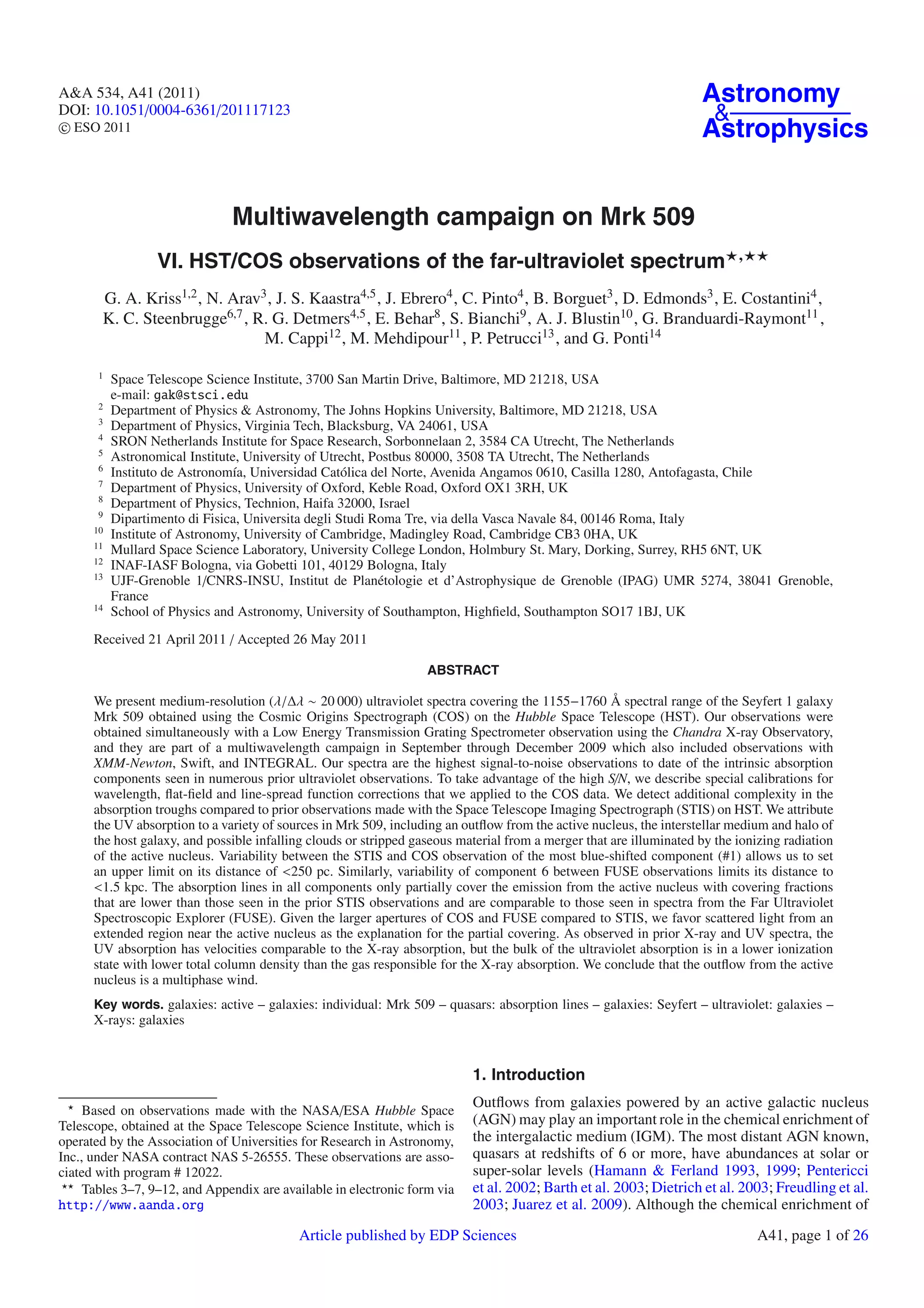 This document describes observations of the Seyfert 1 galaxy Mrk 509 using the Cosmic Origins Spectrograph (COS) on the Hubble Space Telescope (HST). The observations detected absorption features in the ultraviolet spectrum, which are attributed to outflowing gas from the active galactic nucleus as well as gas in the galaxy's interstellar medium and halo. The COS observations provide higher signal-to-noise and resolution than previous observations, detecting additional complexity in the absorption features. Variability in some features constrains the distances of absorbing gas components to be less than 250 pc and 1.5 kpc from the active nucleus. The absorption lines only partially cover the emission from the active nucleus, possibly due to