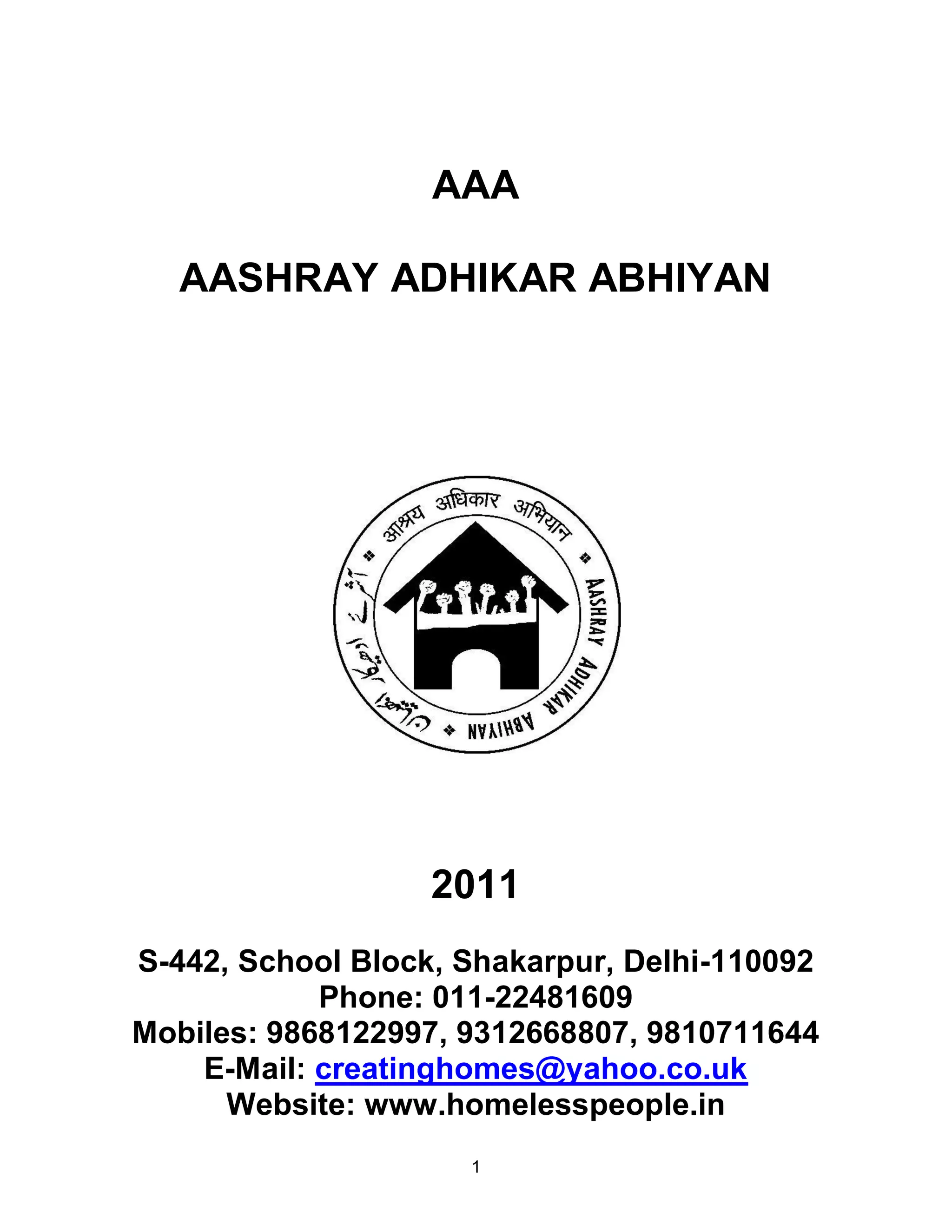 This document summarizes the work of Aashray Adhikar Abhiyan (AAA), an organization working to support homeless people in Delhi, India. AAA was established in 2000 to advocate for the rights of homeless people as protected under the Indian constitution and international law. It estimates there are over 1.5 lakh (150,000) homeless people in Delhi, many of whom are migrants from rural areas with no access to basic services. AAA works to empower homeless communities, provide temporary and permanent shelters, facilitate collective action, conduct legal advocacy, and operate mobile health clinics.