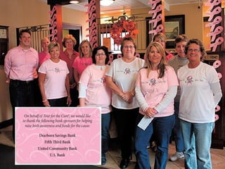 The Vera Bradley Foundation for Breast Cancer was founded in 1993 by Vera Bradley Co-founders Barbara Bradley Baekgaard and Patricia R. Miller after the loss of their friend Mary Sloan to breast cancer. Their mission is to save lives and end breast cancer. Since 1998, the Foundation has raised nearly $17 million under the leadership of Drs. Hari Nakshatri and Kathy Miller. The Dearborn County Tour for the Cure program has raised over $37,000 for the Foundation since 2008 through tourism activities that allow visitors to support breast cancer research.