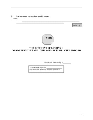 The document provides information about an academic English course outline at First Choice Language School. It details the course schedule, requirements, and ways students can improve their listening skills. The course runs for one term and meets on Mondays, Wednesdays and Fridays. Students must come to class prepared and can make up missed work. The document also provides guidance on writing an academic essay exam, including spending time planning, organizing ideas, and checking for errors.