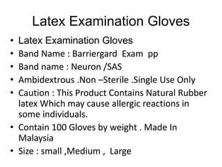 This document appears to be a price list from a medical supply company called Pharma24bd. It lists various medical products available for purchase including latex examination gloves, surgical gloves, blood glucose meters and test strips, surgical cotton, endotracheal tubes, absorbable surgical sutures like chromic catgut and vicryl, and provides supplier information. The document also includes manufacturer details and specifications for some of the listed products.