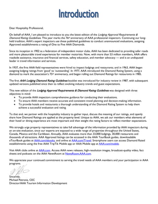 The document provides information about AAA's Diamond Rating System for hotels and restaurants. It explains that AAA uses Approval Requirements, which are mandatory standards, and Diamond Rating Guidelines, which are more flexible, to evaluate properties. The Approval Requirements section lists 33 standards that must be met for a property to receive AAA Approval, covering cleanliness, management practices, exterior/public areas, guestrooms, and bathrooms. Meeting these standards is the first step before a property can be considered for a Diamond Rating.