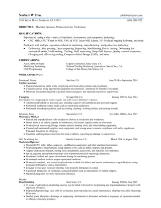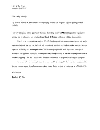 Norbert W. Diaz is applying for an open machine operator or production technician position. He has over 8 years of experience operating CNC and manual machines, including experience with quality control techniques. As a former lead supervisor, he developed techniques that improved accuracy and reduced waste. He believes his experience qualifies him for the company's current needs.