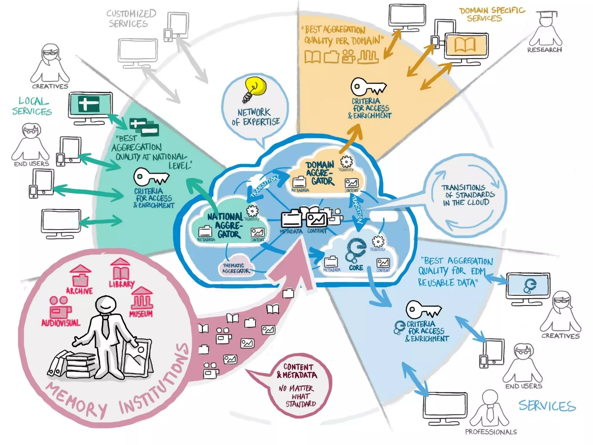 Europeana serves as a platform connecting to 41 million objects of cultural heritage across Europe, leveraging linked open data to enhance metadata for better accessibility and search functionality. The document outlines how Europeana organizes and enriches data through collaboration with various vocabularies and datasets, promoting an open data strategy that allows for increased interoperability and flexibility. It concludes by highlighting the potential benefits and challenges associated with implementing linked data in cultural heritage management.