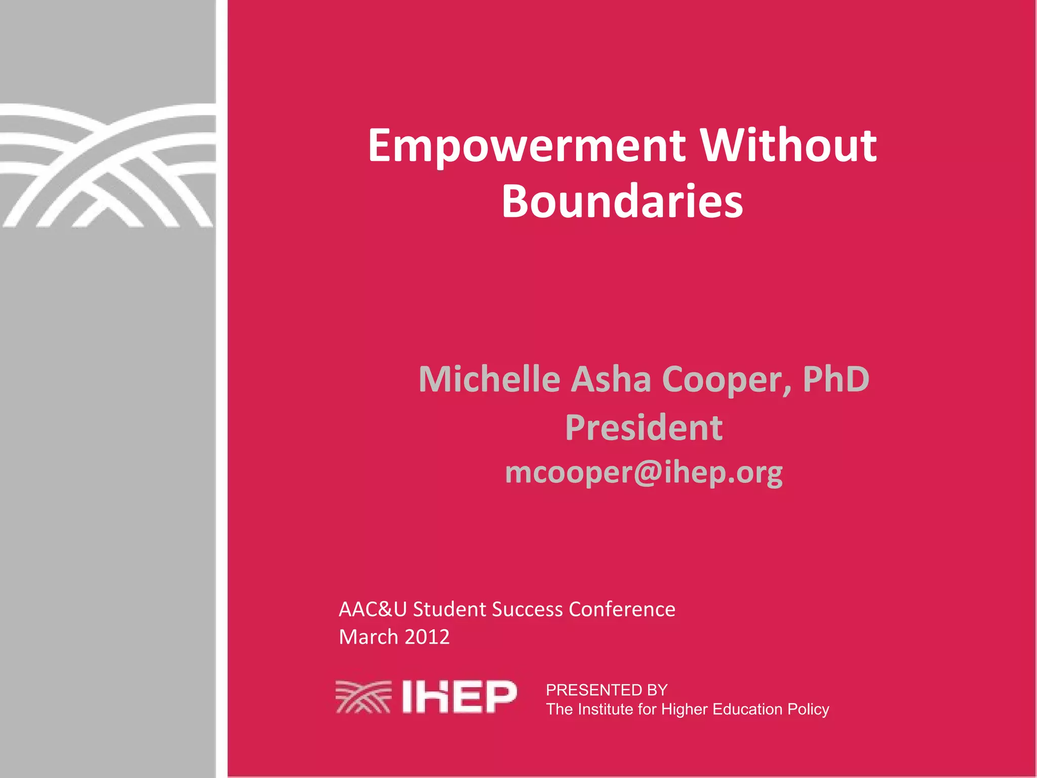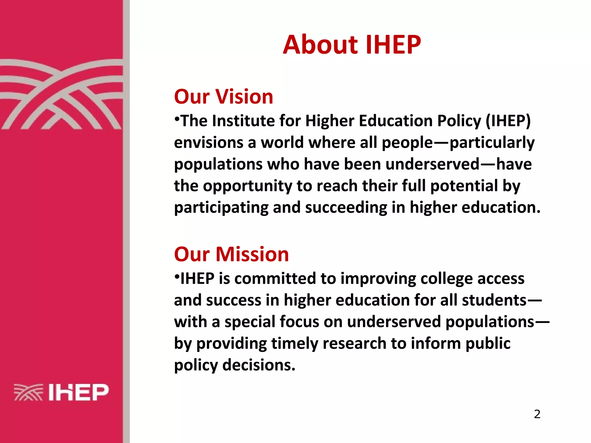 The document discusses the mission of the Institute for Higher Education Policy (IHEP) aimed at increasing college access and success for underserved populations. It highlights alarming statistics showing low enrollment and graduation rates among low-income students, while outlining national goals for increasing higher education attainment. The presentation calls for innovative strategies to improve student retention and completion rates, emphasizing the importance of financial assistance and academic support.