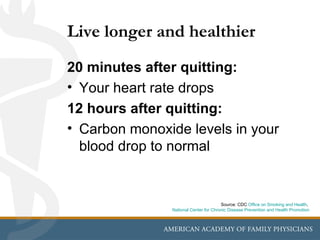 This document provides information on how to quit smoking successfully and permanently. It details the health benefits of quitting smoking at different time periods after quitting. Within 20 minutes, heart rate drops and carbon monoxide levels return to normal. After 2 weeks to 3 months, heart attack risk begins to decrease and lung function starts improving. By 1 year after quitting, the risk of coronary heart disease is half that of a smoker. The document also outlines a 5-step plan to quit smoking, which includes getting ready, getting support, learning new skills, using medication if recommended, and being prepared for cravings. Managing withdrawal symptoms and avoiding relapse are also discussed.