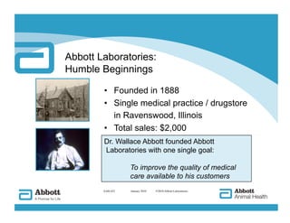 Abbott Laboratories was founded in 1888 by Dr. Wallace Abbott in Illinois with a goal of improving medical care. Today Abbott is a global leader in health care with over 68,000 employees worldwide. Abbott Animal Health has been a partner to veterinarians for over 25 years, providing leading products in areas like anesthesia, diagnostics, and nutrition. Looking to the future, Abbott Animal Health continues developing innovative veterinary solutions and leveraging the research expertise of Abbott Laboratories.
