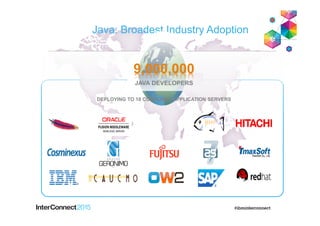 This document provides an overview of new features in Java EE 7, including WebSocket, JSON processing, batch applications, concurrency utilities, simplified JMS, and more. It discusses these features and their availability in upcoming Liberty releases. The roadmap outlines IBM's plans to deliver a full Java EE 7 compliant WebSphere Application Server implementation through continuous delivery of features over the next several months. Related sessions at the conference are also listed.