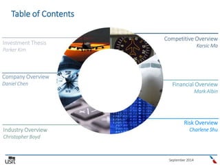 This document analyzes American Airlines Group (AAL) and recommends it as a long investment. It provides an overview of AAL, the airline industry, AAL's competitive position and financials. Key points are that AAL has the largest US network, experienced management from the US Airways merger, and improving profitability margins. While the market remains skeptical due to AAL's bankruptcy, the analysts believe AAL is executing its turnaround successfully and that its profitability and valuation make it underappreciated relative to peers.