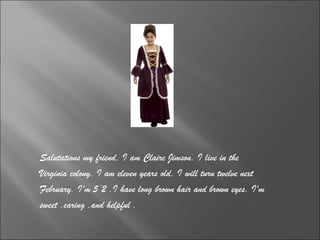 Claire Jimson is an 11-year-old girl who lives in a small log cabin in Virginia with her parents and three sisters. She helps her mother with chores like cooking, cleaning, and doing laundry. Her father works as a farmer growing crops. Claire attends a one-room schoolhouse with 15 other children where they learn basics like writing with a quill. In her free time, Claire enjoys playing games like hoop stick and spending time with her large and close-knit family.