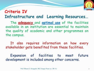 The document outlines the criteria for assessing infrastructure and learning resources at PDEA's Baburaoji Gholap College, focusing on the adequacy and optimal use of facilities like classrooms, laboratories, and libraries. It details key indicators and marks for various infrastructure aspects, including physical facilities, library resources, and IT infrastructure maintenance. Additionally, it highlights the importance of budgeting and resource allocation for enhancing educational facilities over the past five years.