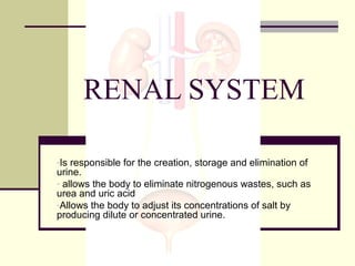 The urinary system is responsible for filtering blood and producing urine. The kidneys filter waste from the blood to form urine, while regulating water and electrolyte levels. Urine travels from the kidneys through ureters to the bladder, where it is stored until excreted through the urethra. The key parts are the kidneys, which contain nephrons that filter blood and reabsorb necessary substances; ureters, which transport urine from kidneys to bladder; and bladder, which stores urine until excretion. Together this system eliminates wastes and regulates fluid and electrolyte balance in the body.