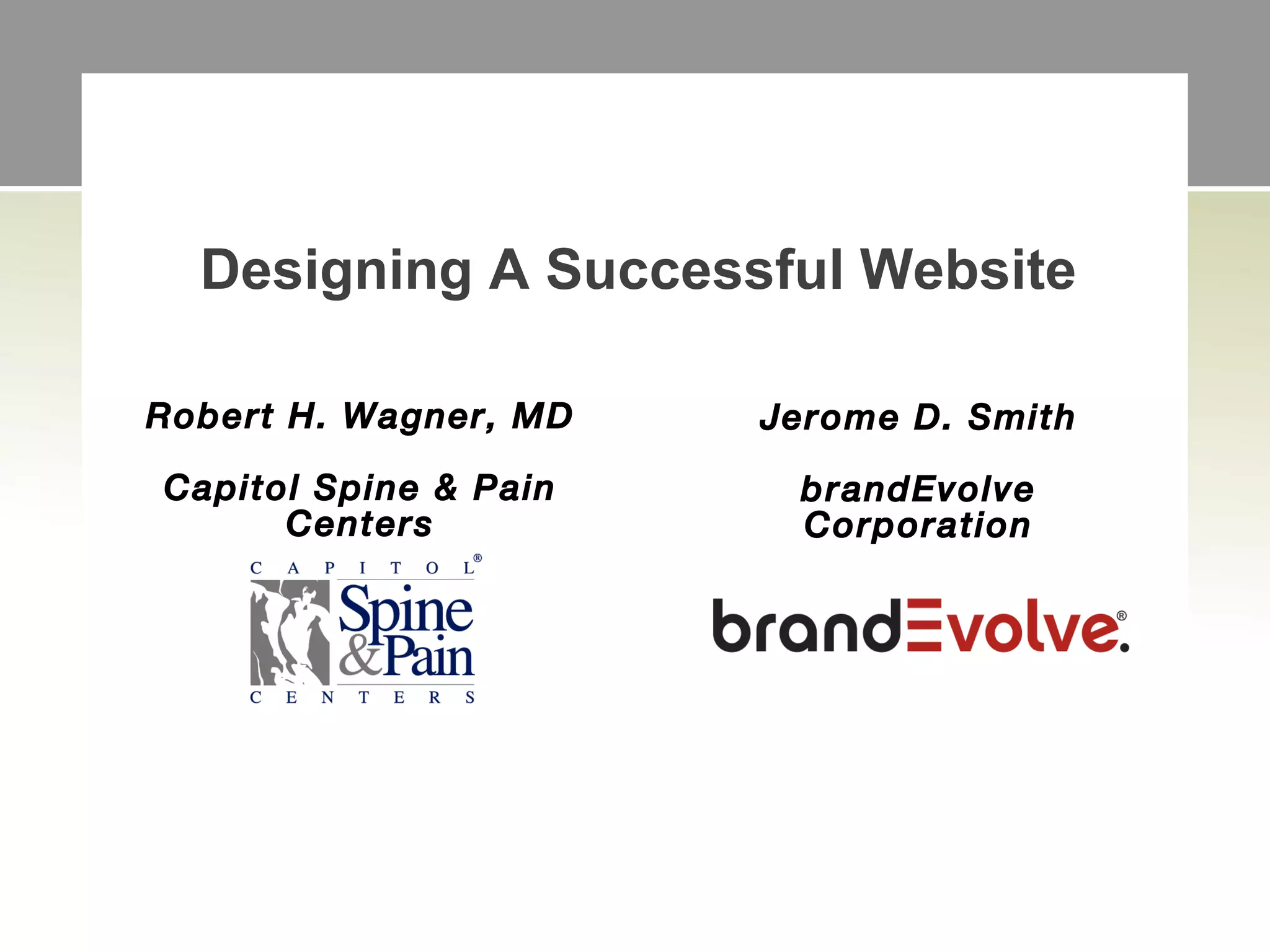 This document provides an overview of designing a successful website for a medical practice. It discusses focusing website content on educating patients and selling the practice's services. Organizing content effectively and determining custom design versus templates is also covered. The presentation emphasizes making the website part of the overall business strategy through search engine optimization, social media, and adding new content regularly.