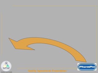 The document discusses quality agreements, which are documents that coordinate quality responsibilities between parties involved in pharmaceutical product development and manufacturing. Quality agreements help ensure compliance, manage risks, facilitate communication and planning, and define accountability. They should clearly establish responsibilities, materials handling and testing requirements, production and validation procedures, auditing standards, and other quality-related processes. Effective quality agreements are simple, clear, comprehensive, and have visibility throughout organizations.