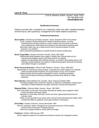 Larry Terry is a veteran journalist with over 30 years of experience in writing, editing, and media relations. He currently works as a senior editor for ICIS Pricing and News covering petrochemical markets. Prior to this role, he held several senior editing and reporting positions at publications like the Houston Chronicle, Chemical Week, and Sun Newspapers. He has expertise in writing, editing, fact-checking, headline writing, and page design/layout.
