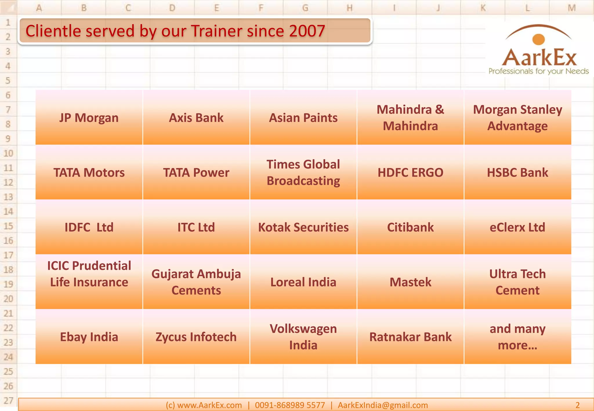 Aarkex offers basic and advanced MS Excel training, focusing on practical skills with modules covering various functionalities such as formulas, data validation, and pivot tables. The courses are designed for individuals with basic computer skills and include features like weekend batches, projector-based training, and personalized instruction. The trainer, S. Sharma, has over six years of experience and has trained professionals from notable organizations.
