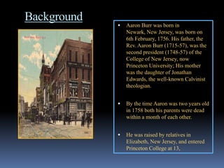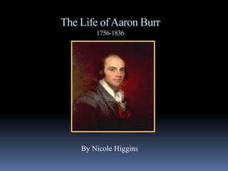Aaron Burr (1756-1836) was an American politician who served as Vice President under Thomas Jefferson. He graduated from Princeton at age 16 and studied theology and law. Burr fought bravely in the Revolutionary War but later killed Alexander Hamilton in a duel in 1804. Burr had a prominent political career but also faced many personal obstacles like losing both parents at a young age and his wife to cancer. He died of a stroke at age 80 in Staten Island, New York.