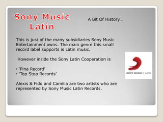 Sony Music Entertainment owns several subsidiary record labels that focus on different music genres, including Sony Music Latin, Sony MusicMasterworks, Sony Music UK, and Sony Music Nashville. Sony Music Latin supports Latin music and has artists like Alexis & Fido and Camilla. Sony Masterworks focuses on classical and jazz genres, representing artists such as Enrico Caruso and Placido Domingo. Sony Music UK operates under labels like RCA Label Group and Phonogenic Records, featuring artists in genres like soft rock, pop rock, and pop. Sony Music Nashville concentrates on country music and has a number of country artists signed, such as Casey James, Sara Evans, and Miranda Lambert.