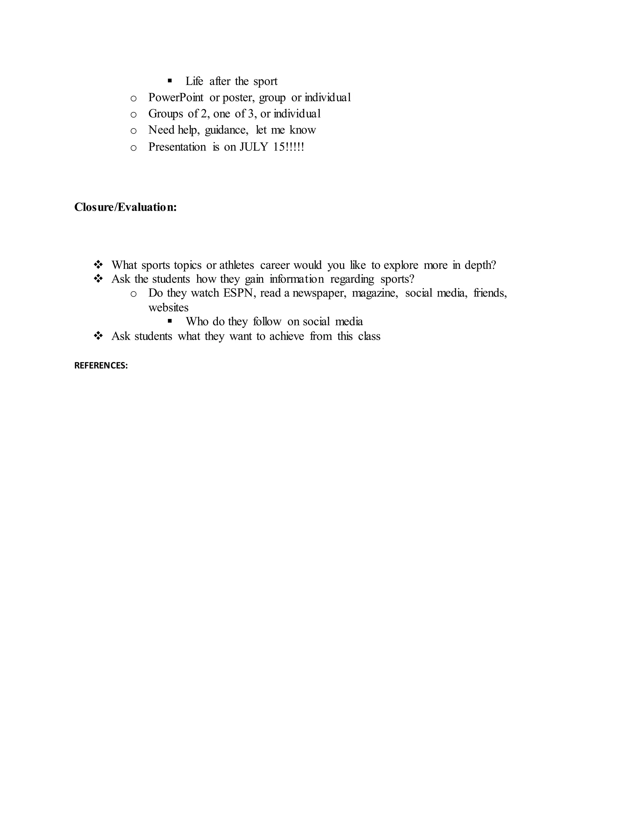 This daily lesson plan outlines a class on sports figures in society. The lesson for the day is an introduction and course overview. Procedures include introducing learning objectives, taking attendance, an icebreaker activity where students share facts about themselves, and discussing the syllabus. The closure will involve asking students about sports topics and athletes they want to explore, how they get sports information, and what they hope to achieve from the class.