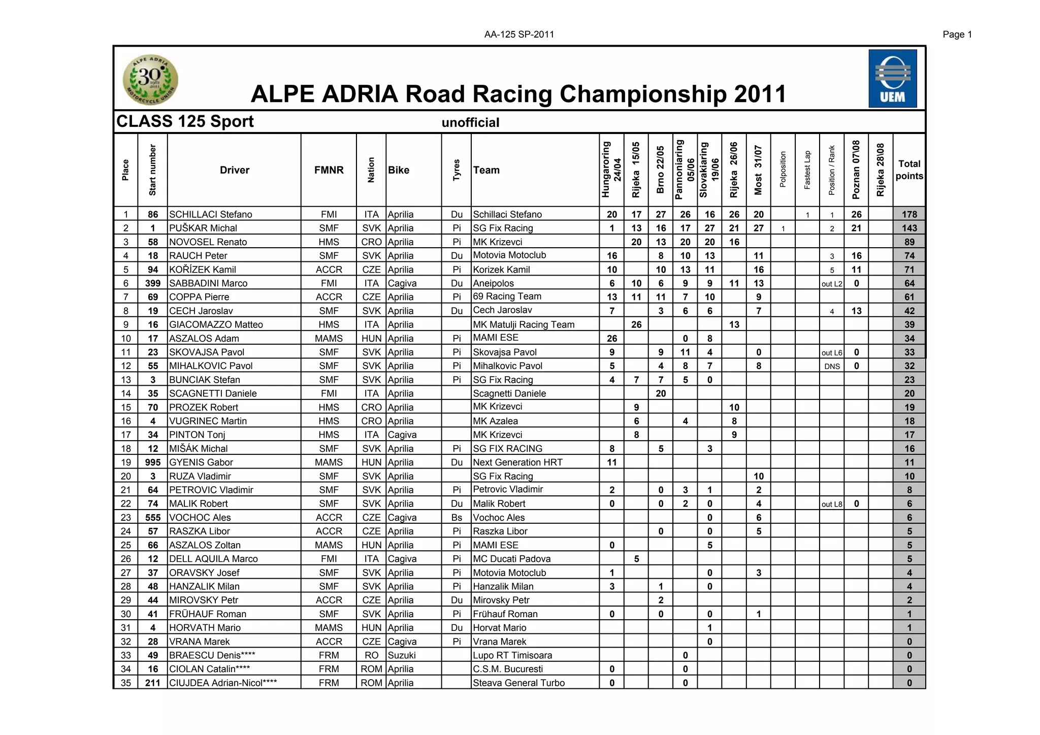 The document provides results from the 2011 ALPE ADRIA Road Racing Championship in three classes: 125 Sport, 125 GP, and SSt 600. In the 125 Sport class, Stefano Schillaci from Italy finished in first place overall with 178 points. In the 125 GP class, Alessio Cappella from Italy came in first with 106 total points. In the SSt 600 class, Lukas Jasensky from Slovakia was the winner with 120 points. The document lists the ranking of the top drivers in each class based on their performances across multiple races that took place between April and August 2011.
