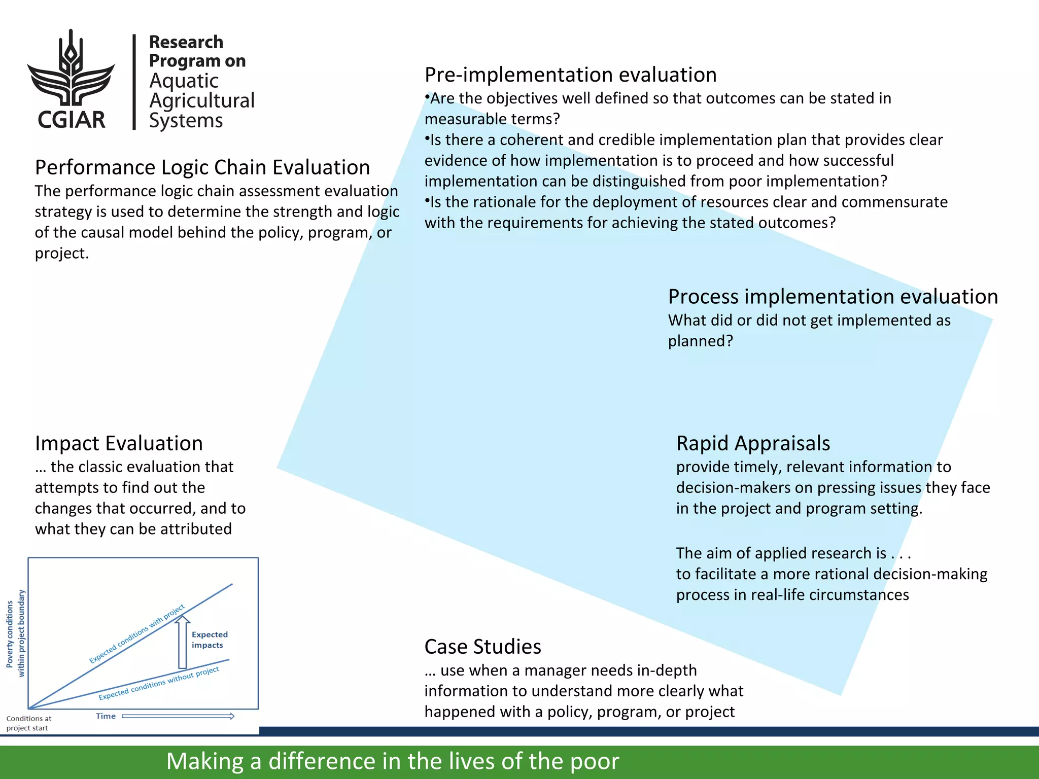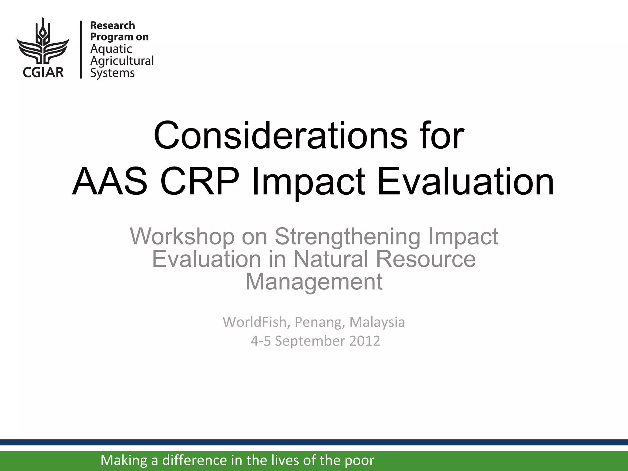 2) It then focuses on outlining considerations for evaluating the impact of the CGIAR Research Program on Aquatic Agricultural Systems, including defining intermediate development outcomes and hub-level challenges in different geographic locations.
