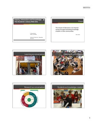 The document discusses strategies for creating an interactive student library website using widgets and Web 2.0 tools. It recommends adding widgets that push content like RSS feeds, bookmarks, images and videos to make the site more engaging for students. Examples of widgets that allow students to gather data, discuss, share and collaborate are provided. The document also suggests linking to various Web 2.0 tools on the site to support student activities like brainstorming, organizing, analyzing and sharing information. The goal is to facilitate student knowledge creation and involvement through an interactive online environment.