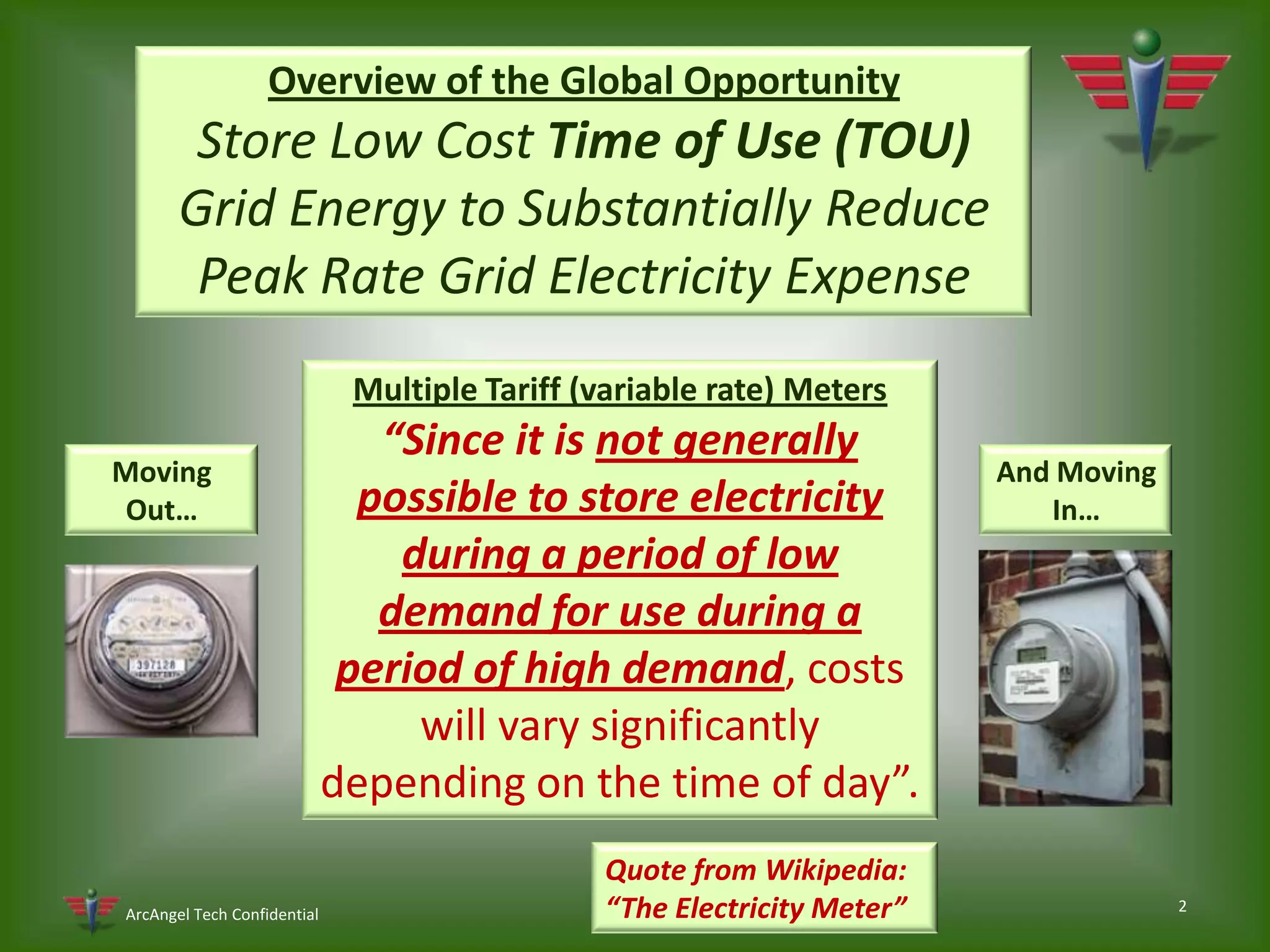 The document discusses an intelligent power controller called the AIPC that can store low-cost off-peak electricity and use it during peak times to significantly reduce electricity costs for consumers. It works by installing between the utility meter and breaker panel to intelligently manage grid power usage. Field tests are planned in early 2010 across different industry sectors to demonstrate the AIPC's ROI within a few months of use. The company is seeking $3 million in funding to complete production, certification, and launch the AIPC commercially.