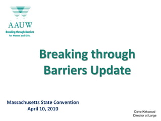 The document provides an update on the Breaking Through Barriers conference held on April 17, 2010. It discusses the transition report, the implementation of the one member one vote policy, connecting members online, the breaking through barriers awards program, and things to watch for in the upcoming year such as surveys and the national convention.