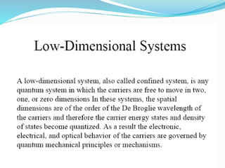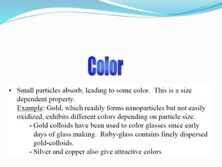 - The properties change due to increased surface area to volume ratio at the nanoscale and quantum effects dominating behavior. The increased surface area affects chemical reactivity, while quantum effects influence bandgap and magnetic properties.