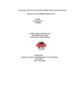 This document summarizes a student project on analyzing the market for plastic and glass bottles in the coming days. It was submitted by Anuj Bajpai to INMANTEC under the guidance of Professor Bhawna Garg. Anuj conducted the project as part of his practical training at Varun Beverages in Ghaziabad from May to July 2008. The project involved research methods like questionnaires and sampling to understand the market for different types of bottles. It also included a SWOT analysis of plastic versus glass bottles and considerations like advantages and limitations of using questionnaires.