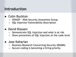 This document summarizes a presentation on SQL injection prevention. It introduces the three presenters - Colin Buckton from OWASP, David Klassen who will demonstrate SQL injection, and Jose Kaharian who will discuss the BSIMM study. Buckton covers OWASP resources and describes SQL injection vulnerabilities. Klassen demonstrates SQL injection in a code sample and how to prevent it. Kaharian discusses a study of software security initiatives in businesses and how secure coding is becoming a priority in hiring. The presentation aims to raise awareness of SQL injection risks and prevention best practices.