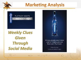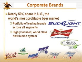 The document provides an overview of Anheuser-Busch InBev's history, financial performance, industry analysis, marketing strategies, and recommendations for global expansion. It traces AB InBev's origins to 1852 and highlights its growth into the largest brewery through acquisitions and innovative marketing. The analysis finds opportunities in expanding experiential marketing and leveraging rising beer consumption in Asia-Pacific markets through premium brands and production expansion in high-growth countries.