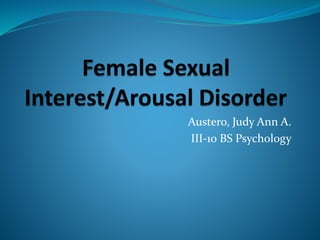 This document discusses diagnostic criteria for several sexual disorders including female sexual interest/arousal disorder, genito-pelvic pain/penetration disorder, and male hypoactive sexual desire disorder. It outlines the key symptoms that must be present for a minimum duration of 6 months to qualify for each diagnosis, including lack of interest, arousal or pleasure. It also notes that disorders can be lifelong or acquired and that prevalence varies depending on factors like age, culture and whether problems are persistent or intermittent.