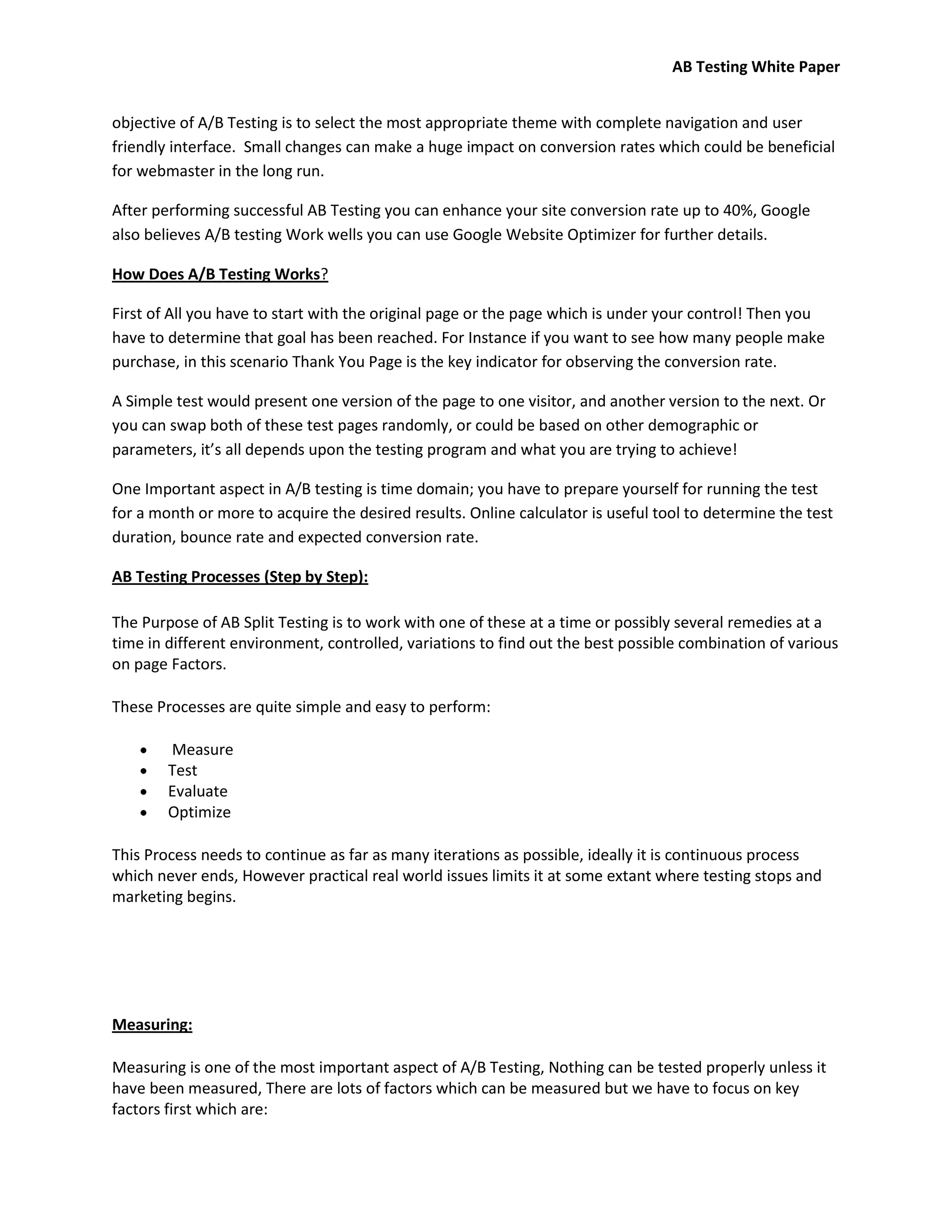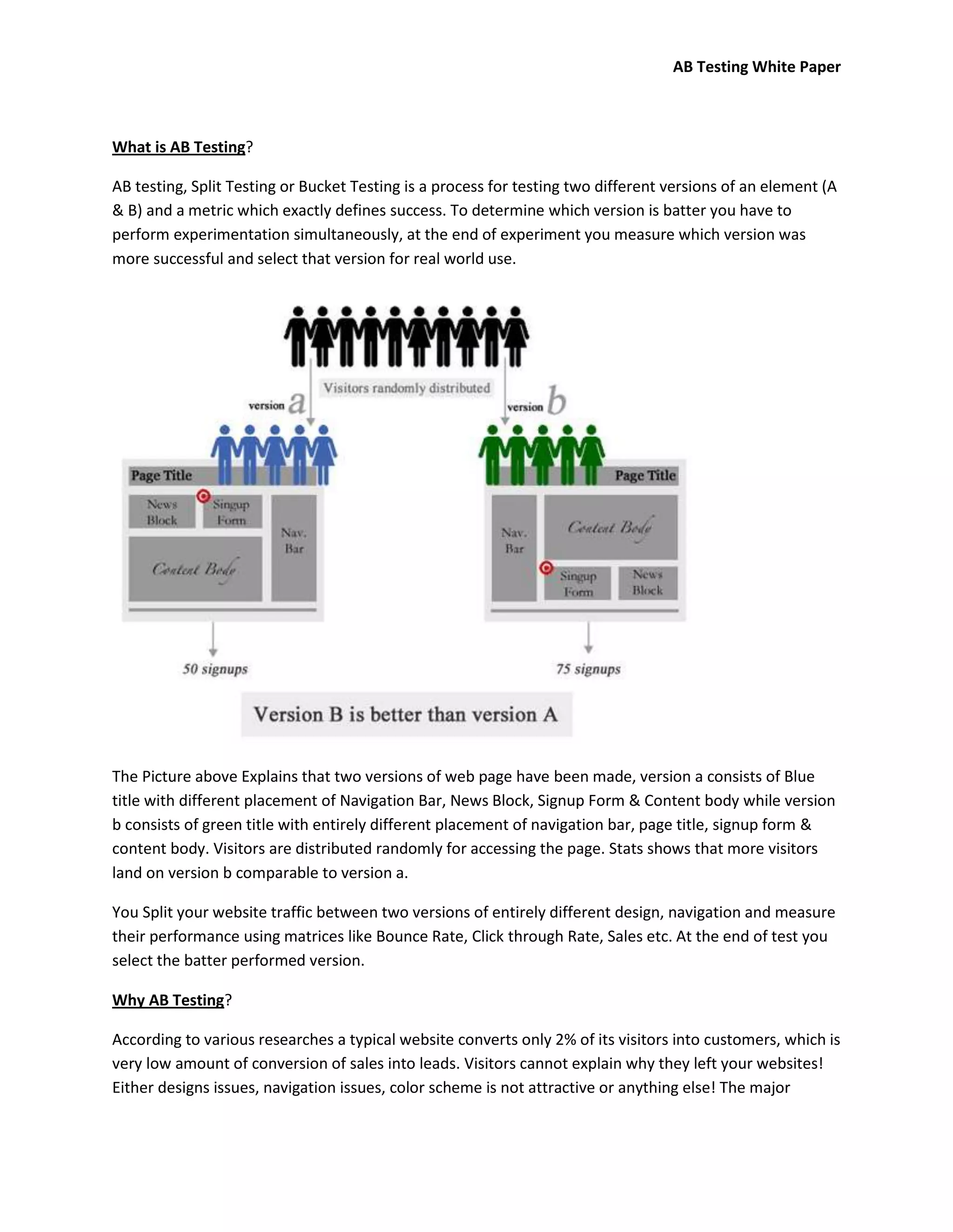 AB testing, also known as split testing or bucket testing, involves testing two versions of a webpage element (A and B) and measuring a specific metric to determine which performs better. The document discusses how AB testing works by randomly distributing visitors to different page versions and measuring metrics like bounce rate and click-through rate. It also outlines the typical AB testing process of measuring performance, testing variations, evaluating results, and optimizing the best performing version. Benefits include measuring real user behavior, determining what drives conversions, and ability to test small differences with large traffic. Limitations include needing clearly defined goals and fully implemented designs to test.