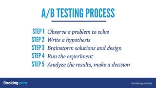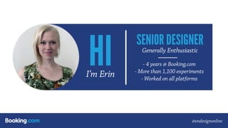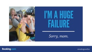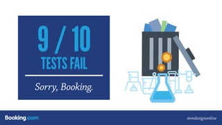 By Erin Weigel | Senior Designer at Booking.com “We tested that, and it failed.” This typical excuse is rampant in the world of A/B testing, but it can overlook the fact that a concept in and of itself is fundamentally different from the execution of a concept. In this talk Erin shares insights about why A/B tests fail from over 1,100 experiments she's run at Booking.com over the past 4 years.