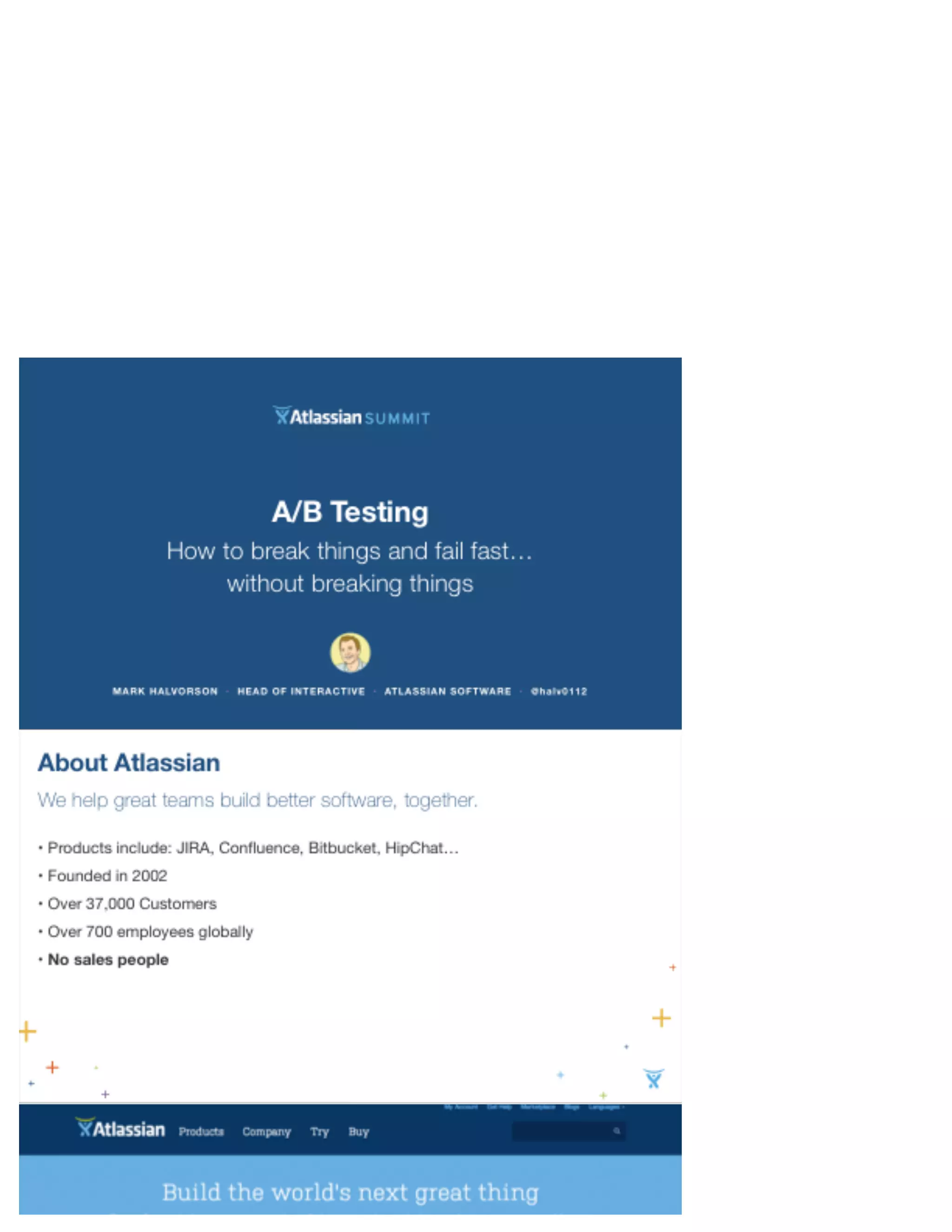 Everyone wants to optimize their web property, especially if that web property is their only sales channel. In this talk, we will explore how Atlassian has used their CMS along with JIRA, Confluence, and other tools to operationalize A/B testing to continually optimize Atlassian's website. Using this process we can balance failing fast with keeping things running smoothly.