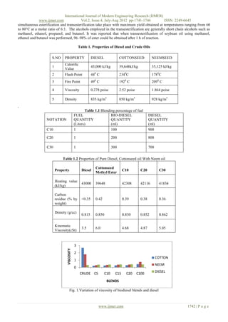 The document investigates cotton seed oil and neem methyl esters as biodiesel fuels in a CI engine. Cotton seed oil and neem oil were converted to methyl esters through a transesterification process. Various blends of the cotton seed and neem methyl esters with diesel were tested in a single cylinder diesel engine. Test results showed that the C20 blend, which is 20% cotton seed methyl ester and 80% diesel, had performance closest to diesel. Emissions and smoke were also lower for the biodiesel blends compared to pure diesel. Overall, the study found that cotton seed methyl ester provided better engine performance than neem methyl ester and that the C20 blend is a
