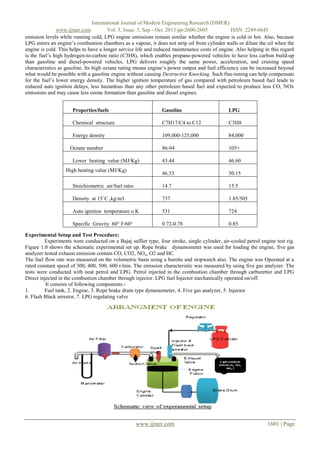 This document discusses experimental investigations on exhaust emissions from a four-stroke spark ignition engine using liquefied petroleum gas (LPG) as an alternative fuel. The study evaluates performance and emission characteristics, highlighting that LPG results in lower carbon monoxide, hydrocarbons, and carbon dioxide emissions compared to gasoline. However, nitrogen oxide emissions are higher with LPG due to elevated combustion temperatures, suggesting that further research is necessary to optimize the use of LPG in internal combustion engines.