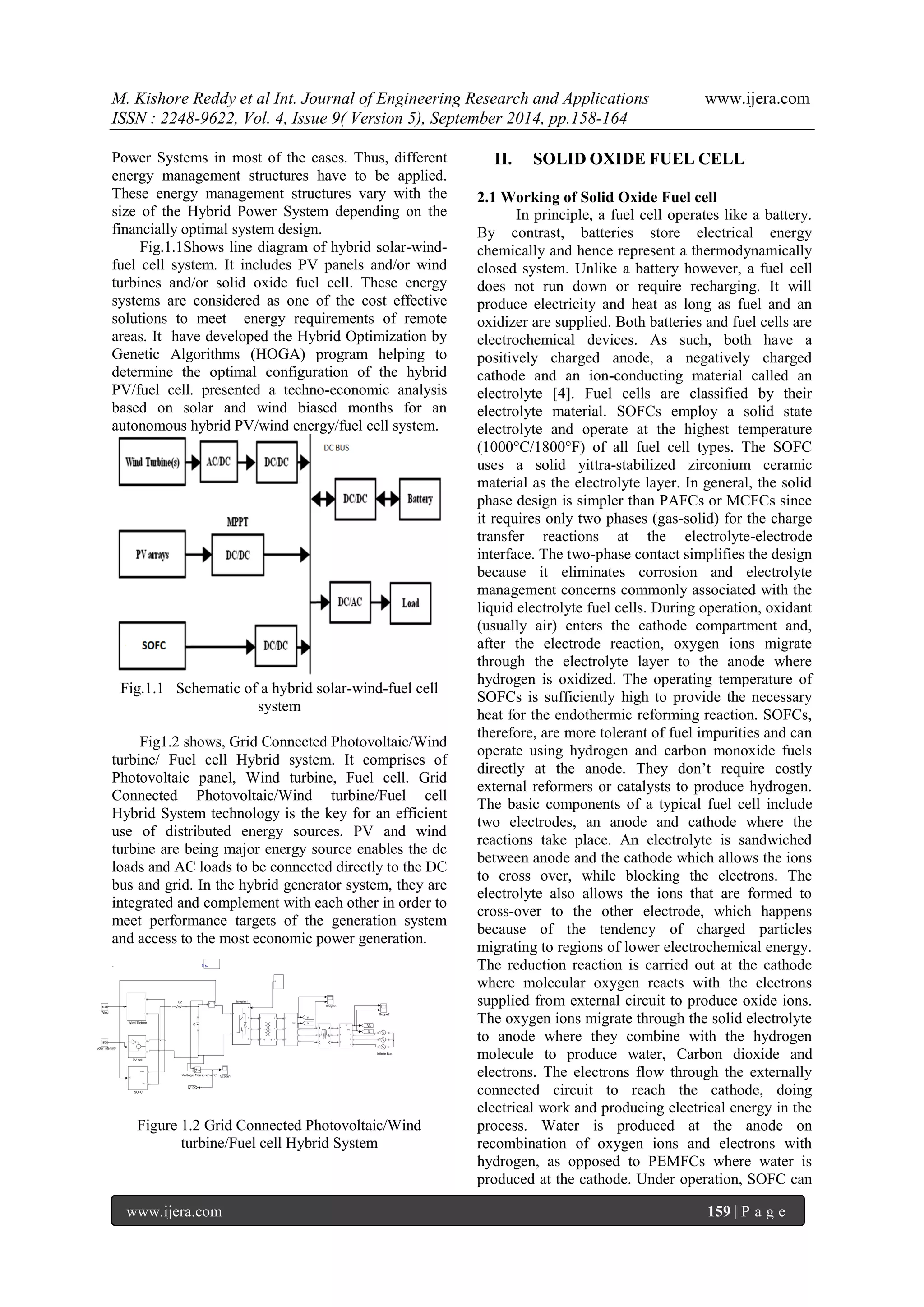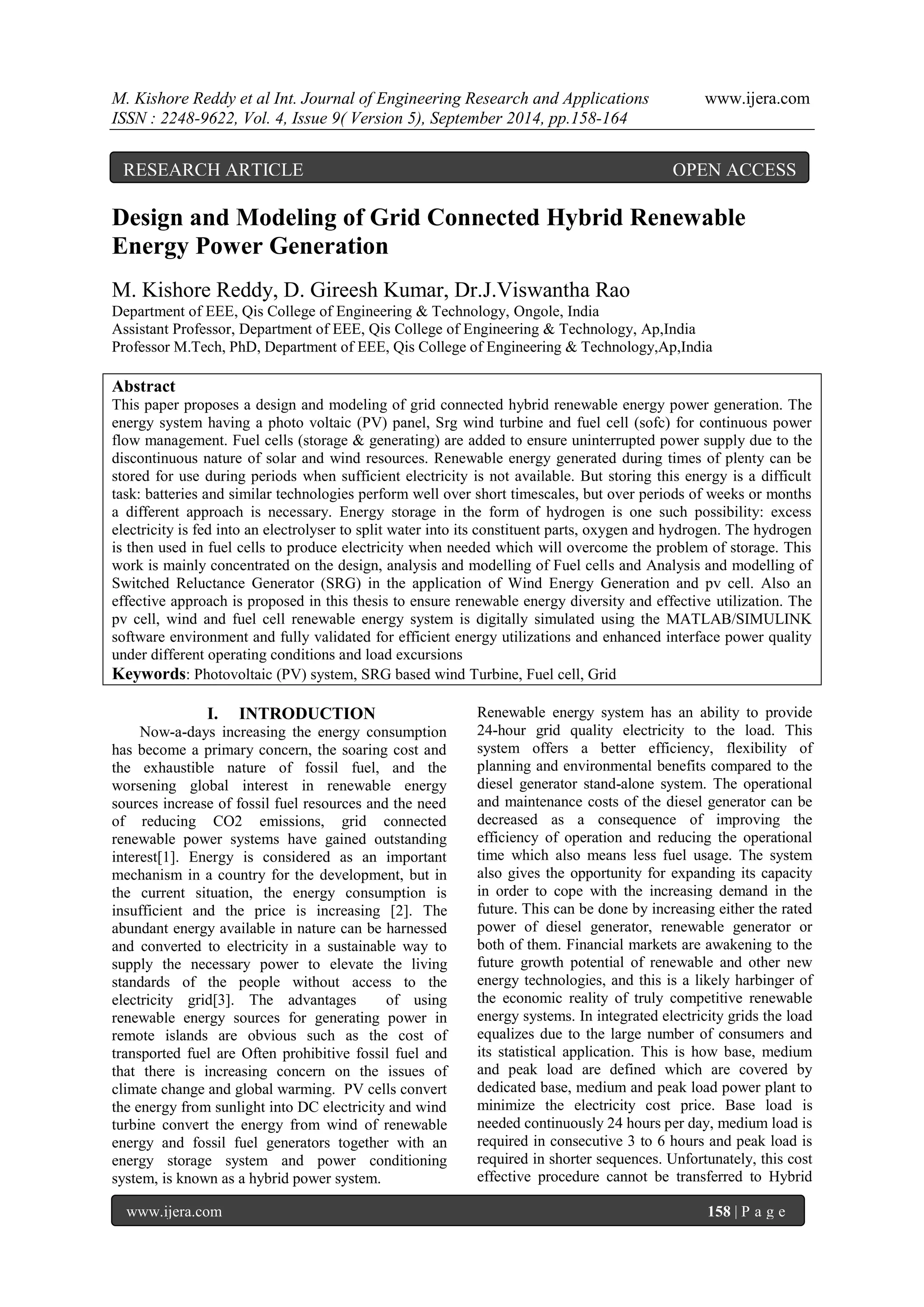 The paper discusses the design and modeling of a grid-connected hybrid renewable energy power generation system utilizing photovoltaic (PV) panels, switched reluctance generator (SRG) wind turbines, and solid oxide fuel cells (SOFC) to ensure a continuous power supply. It addresses the challenges of energy storage and proposes hydrogen as a viable solution, along with simulations performed in MATLAB/Simulink for efficiency validation. The study emphasizes the importance of integrating various renewable sources to enhance energy access and efficiency, particularly in remote areas.