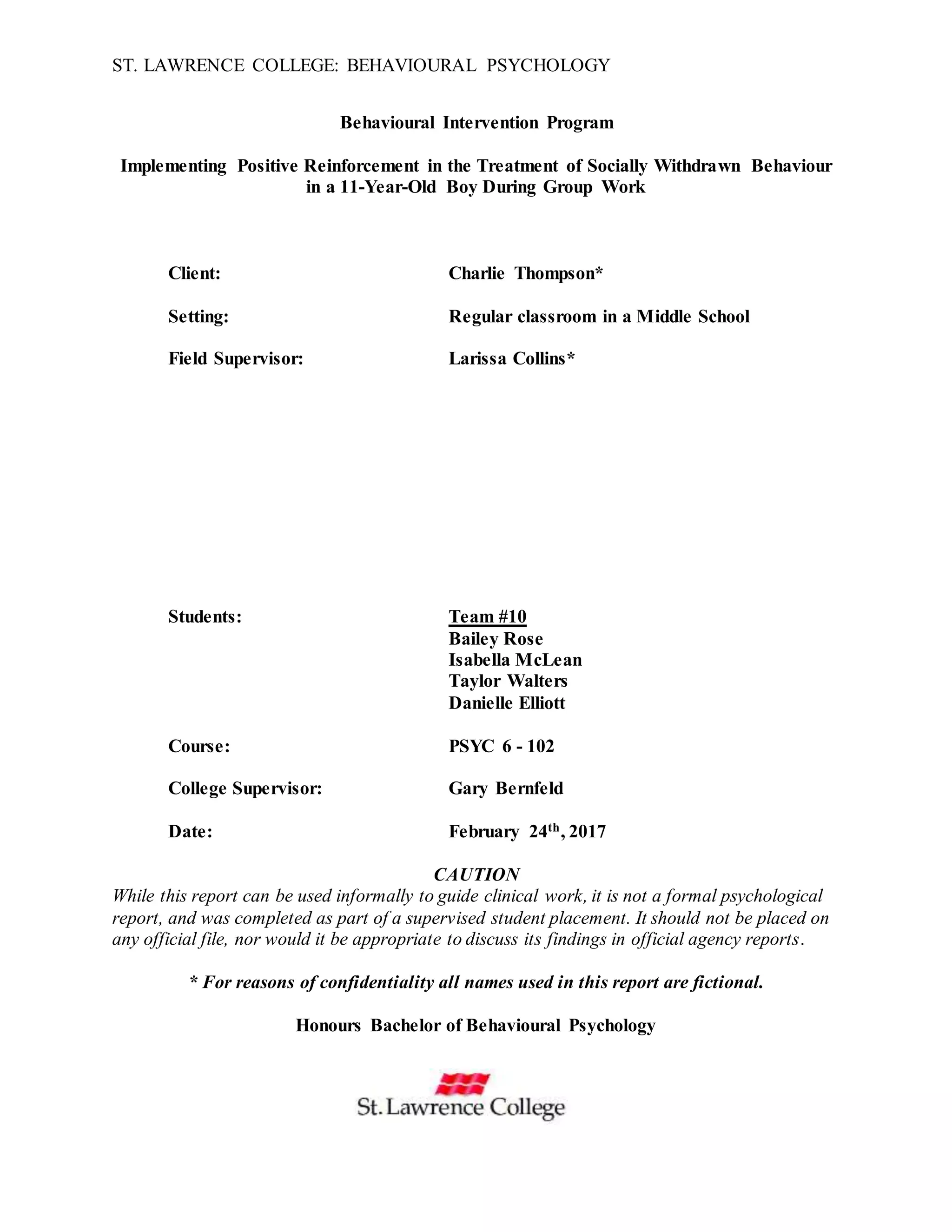 The document outlines a behavioral intervention program aimed at improving the social interactions of an 11-year-old boy named Charlie Thompson, who was socially withdrawn during group activities in school. Utilizing positive reinforcement techniques, the intervention effectively increased Charlie's participation from an average of 18% to 45.33% in social interactions over a 15-day period. The report suggests ongoing application of the methods across different classes to further generalize Charlie's improved social skills.