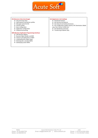 The document outlines the curriculum for an ABAP course offered by Acute Soft Solutions in India, detailing various units covering ERP introduction, ABAP programming basics, report creation, transactions, batch data communication, SAP scripts, advanced ABAP concepts, EDI, BAPI, and ALE. Each unit contains topics such as SAP architecture, programming structures, report types, data transfer methods, and integration techniques. It serves as a comprehensive guide for individuals looking to gain proficiency in ABAP and SAP-related technologies.