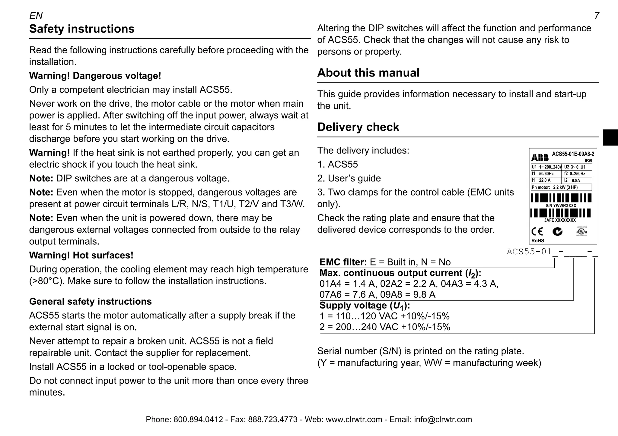 The document provides installation and safety instructions for an AC drive (ACS55) for controlling the speed of 3-phase AC induction motors from 0.18 to 2.2 kW. Key steps include checking the delivery, ensuring a suitable installation environment, mounting the unit, setting DIP switches to match the motor and application, connecting power and motor cables, and setting the speed reference. Safety warnings advise only allowing a competent electrician to install the drive and never working on the drive or motor with power applied due to dangerous voltages present even when stopped.