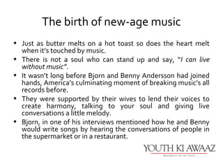 ABBA was a Swedish pop group formed in the 1970s that achieved great commercial success with catchy songs featuring harmonized vocals. Their music appealed to people of all ages and bridged generational divides. Hits like "Mamma Mia", "Dancing Queen", and "The Winner Takes It All" topped the charts and continue to be popular today. A film adaptation of "Mamma Mia" was also a box office success that featured the group's music to tell a story. ABBA went on to become one of the best-selling music groups of all time.