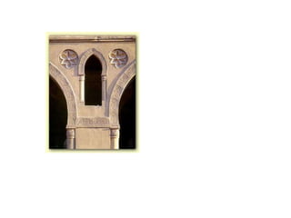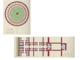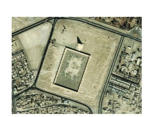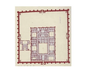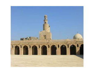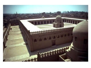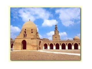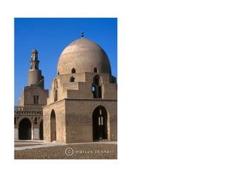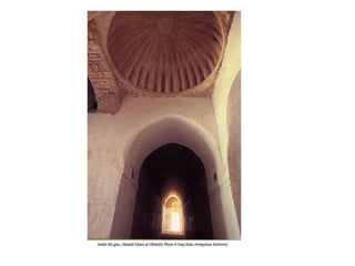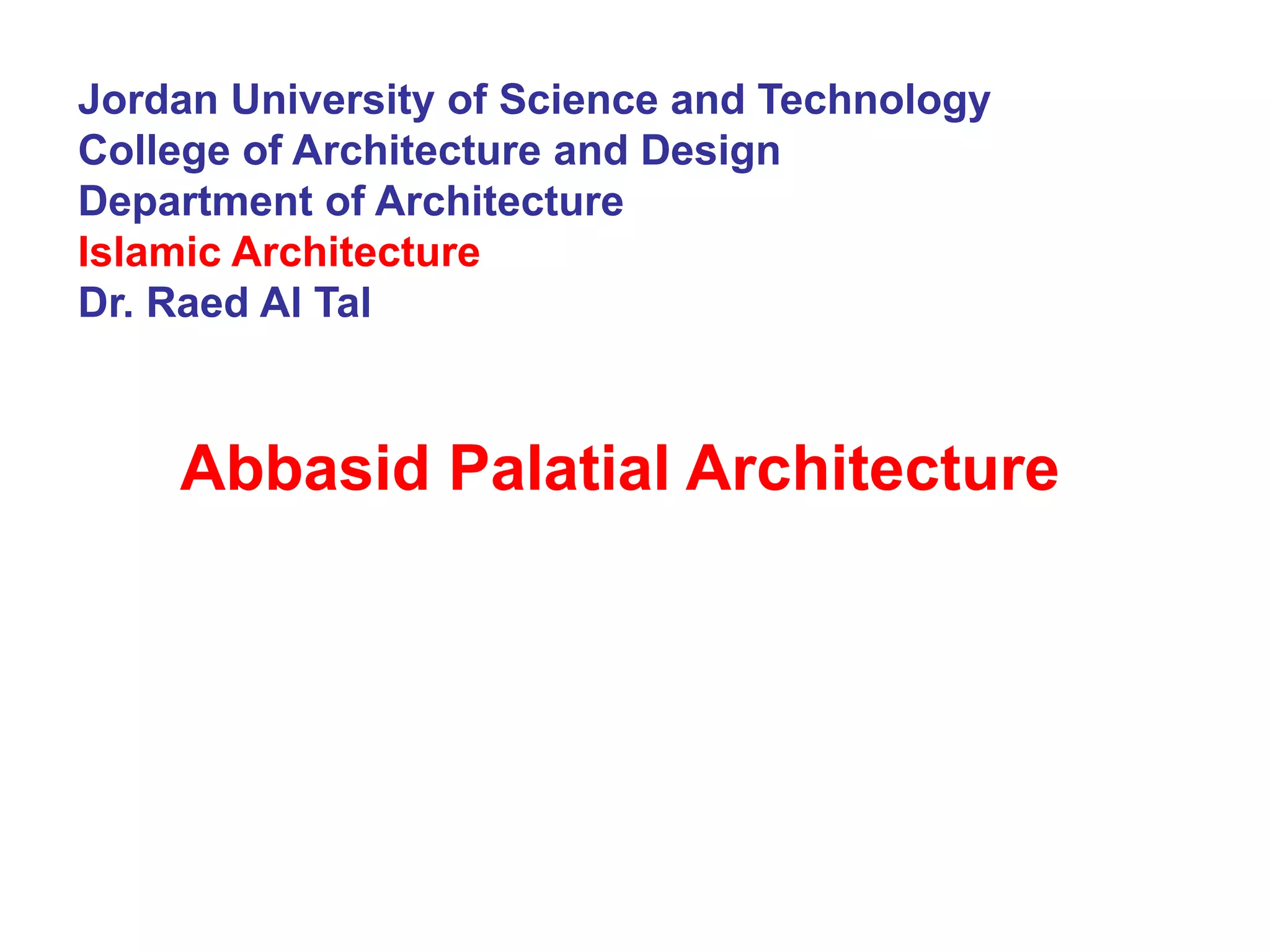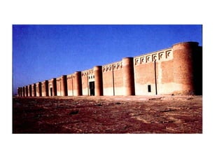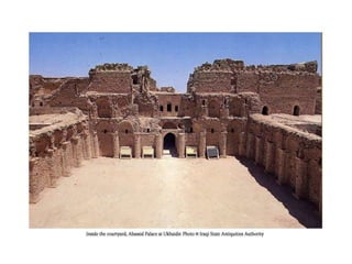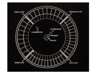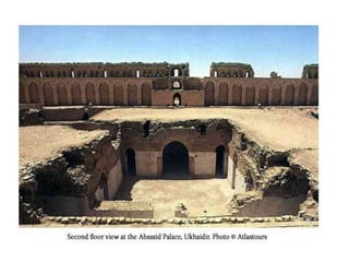 The Abbasids established Baghdad as their capital in the 8th century. They were influenced by Persian architectural styles and traditions, adopting features like monumental palaces centered around large courtyards and iwans. The Abbasid caliph Al-Mansur founded the circular planned city of Baghdad, while later caliphs built lavish palaces like Ukhaydir and Samarra, characterized by fortified enclosures, towers, and elaborate decorative elements. The Abbasids established new models of royal architecture and palatial complexes that demonstrated their power and wealth.