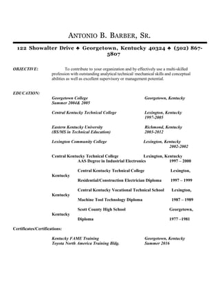 This document is a resume for Antonio B. Barber, Sr. that outlines his objective, education, certificates/certifications, experience/skills, and employment history. He has over 30 years of experience in various skilled trades including industrial maintenance, electrical contracting, welding, and machinist work. He currently works as a skilled trades assessor and instructor and owns his own electrical contracting business. He has an Associate's degree in Industrial Electronics and certificates in various areas such as electrical codes, welding, and machining.