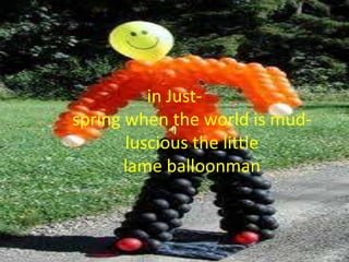 The poem describes a scene of springtime. Children are playing as the "queer old balloonman" whistles in the distance, calling them to play. Spring has made "the world...mud-luscious" and "puddle-wonderful". The balloonman's whistling summons children from various games like hopscotch and jumprope to play.
